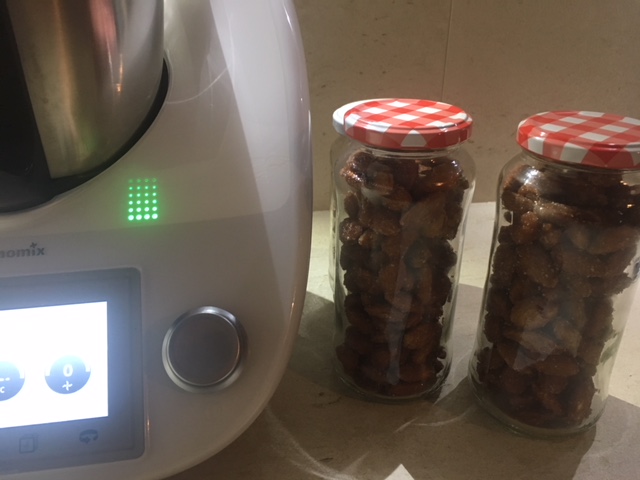- Add the almonds and coat them i nthe honey mixture for 30sec / reverse blades / speed 1 .