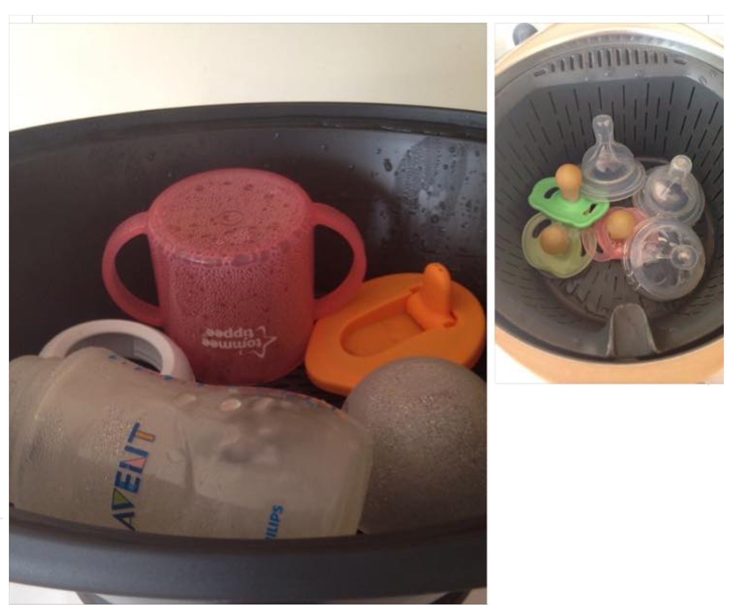 Solo hay que poner 800g de agua en el vaso, poner los chupetes y otras cosas pequeñas en el cestillo y los biberones o cosas mas grandes en la varoma.