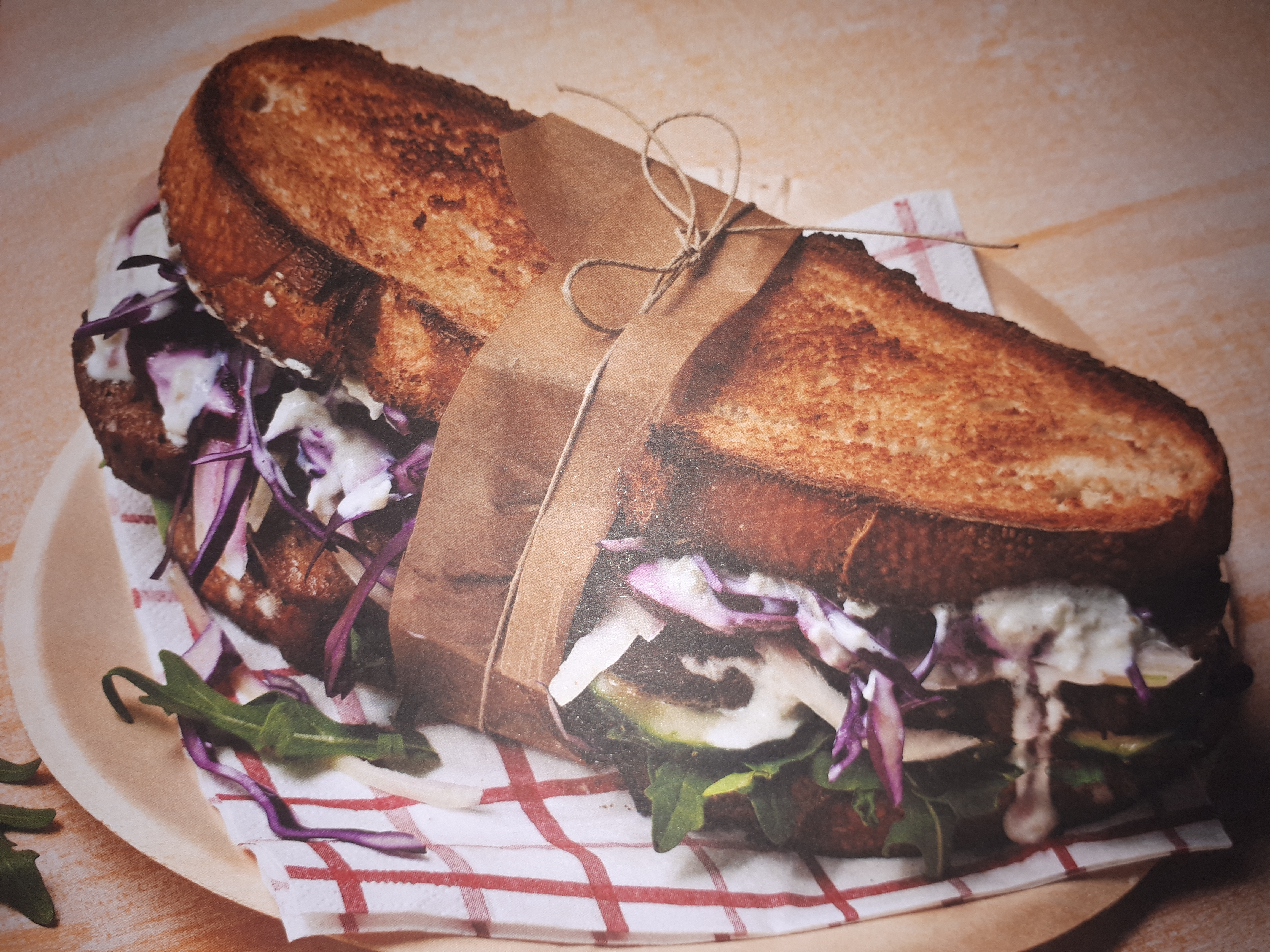 - Unte las rebanadas de pan con el tzatziqui. Ponga la ricia en. 4 rebanadas, rodajas de tomate, de pepino, el seitán, la cebolla, la remolacha y la lombarda. Cubra con las otras 4 rebanadas 6 siete los bocadillos pinchando con palos de brochetas.