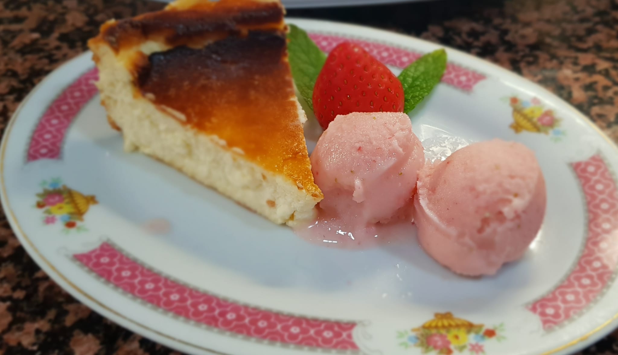 Tarta de Queso La Viña acompañada de helado de fresa y yogur.