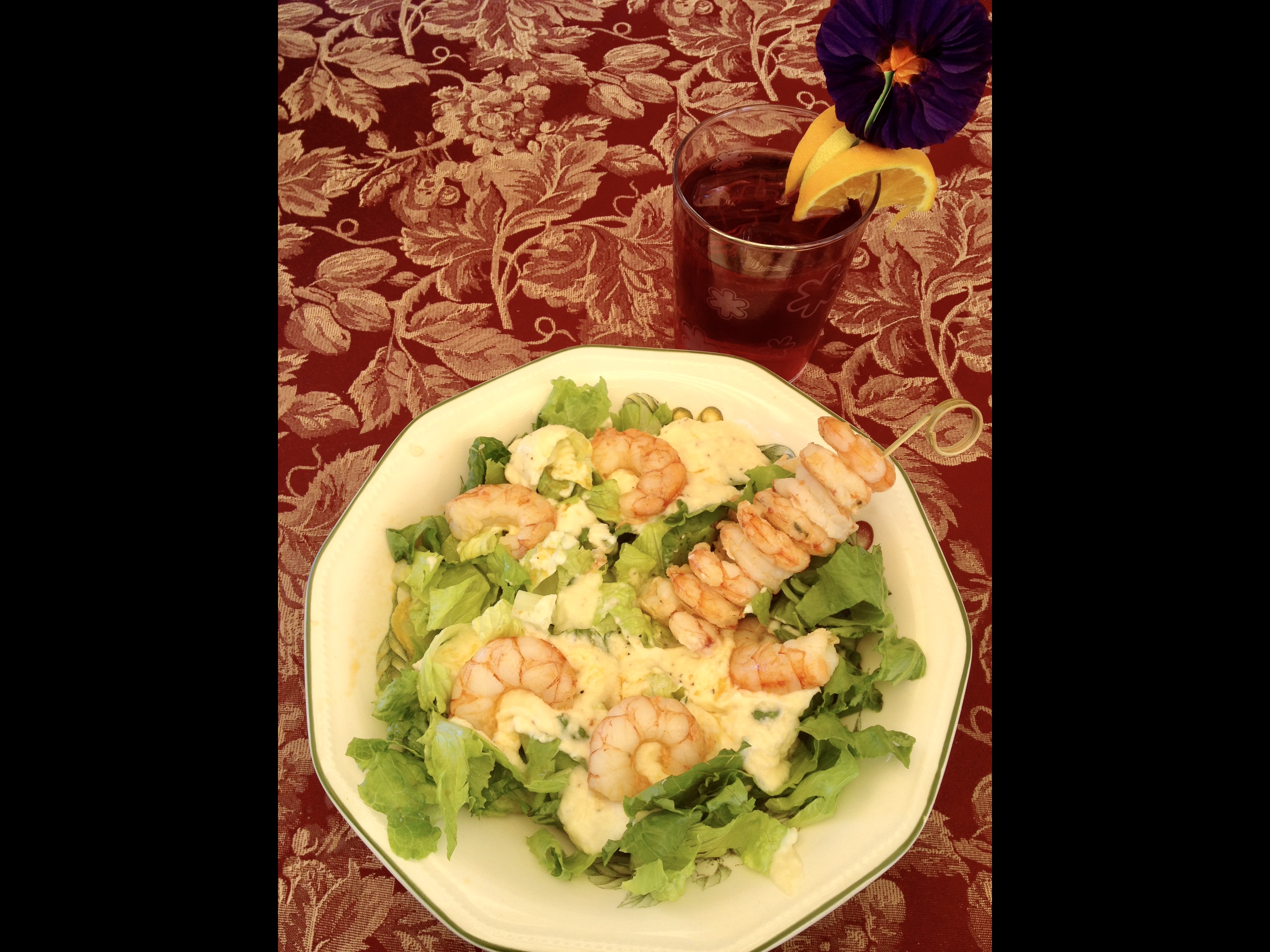 Ensalada de lechuga con brocheta de gambas y mi salsa de queso