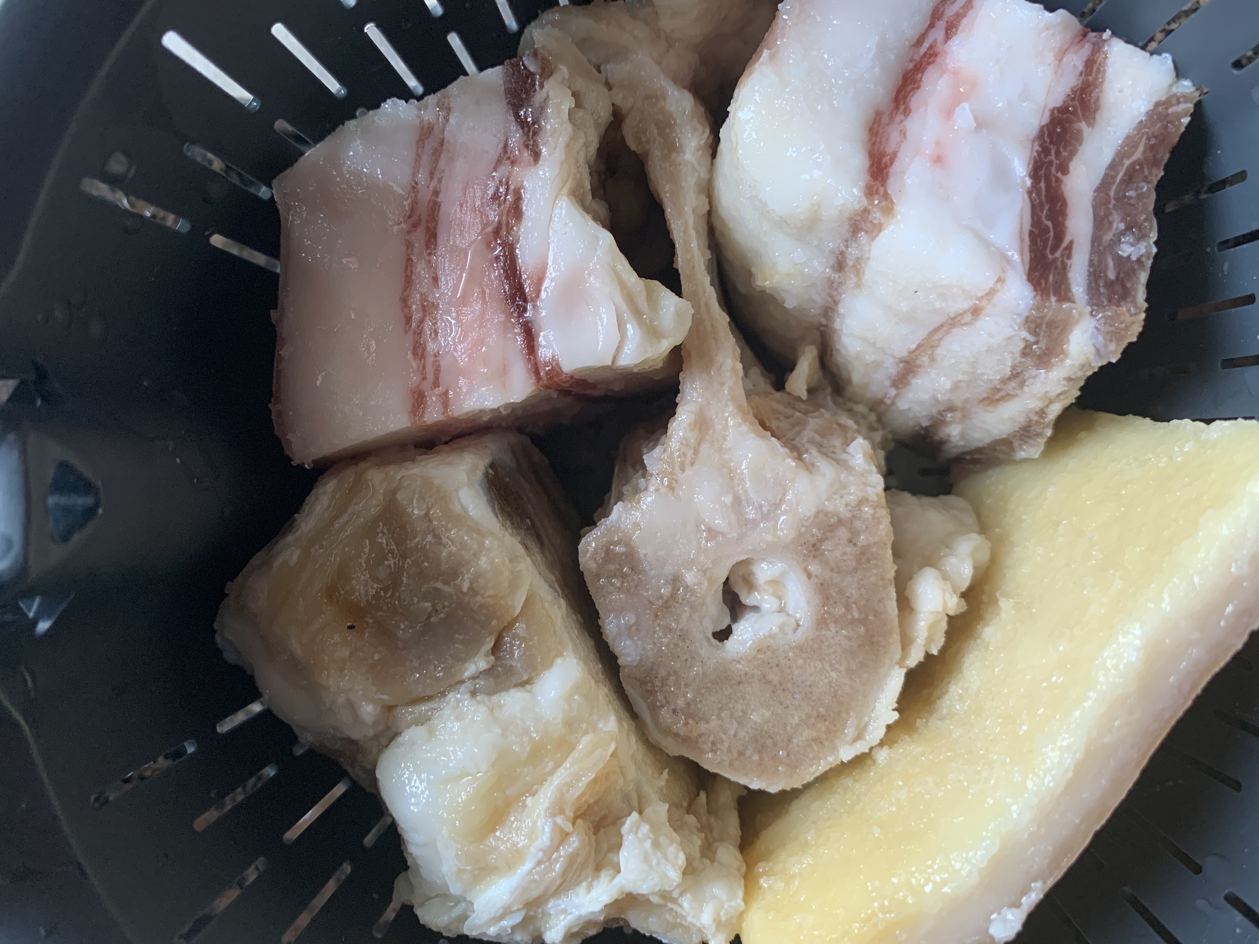 Ponemos en el cestillo: Todo el añejo (hueso, corteza, costilla, tocino), la ternera y el cerdo.