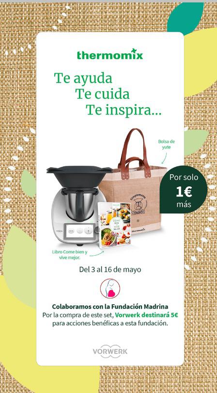 Nueva edición de thermomix, ahora por solo 1 euro más, tienes la bolsa de yute más el libro nuevo de come bien y vive mejor, además si compras ahora, estarías colaborando con la fundación Madrina, ya que vorwerk destinará 5 euros por cada venta del día 3 al 16 de mayo.