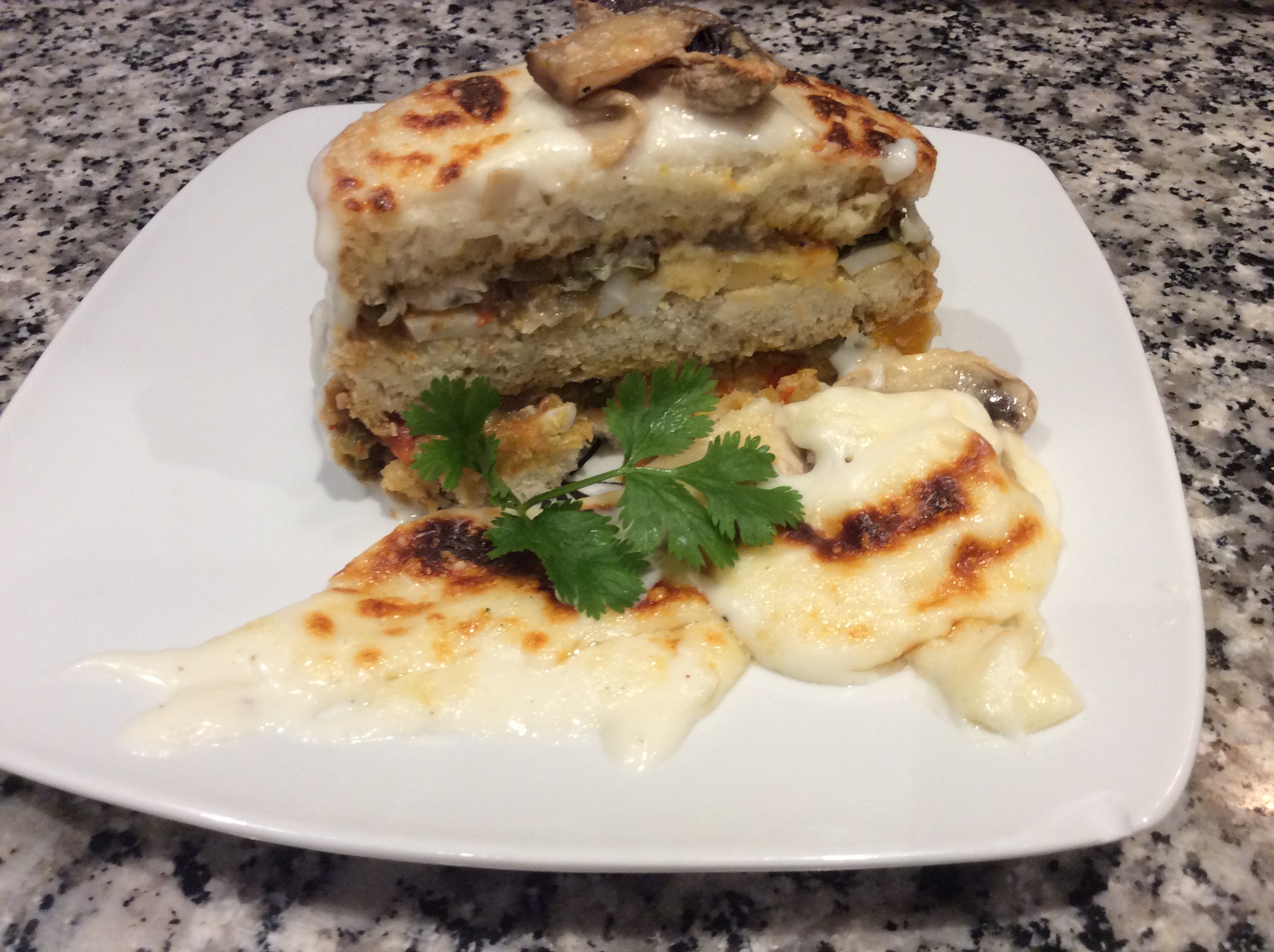 Colocamos en el molde forrado con film o con papel vegetal el pan y una capa de pisto luego una capa de huevo y así hasta terminar con el pisto y con el huevo terminamos con una capa de pan, colocamos un peso encima para que empape el pisto en el pan y lo dejamos reposar un mínimo de dos horas. Pasado este tiempo lo desmoldamos lo cubrimos con la salsa bechamel y agregamos los champiñones y espolvoreamos con el queso y lo gratinamos.